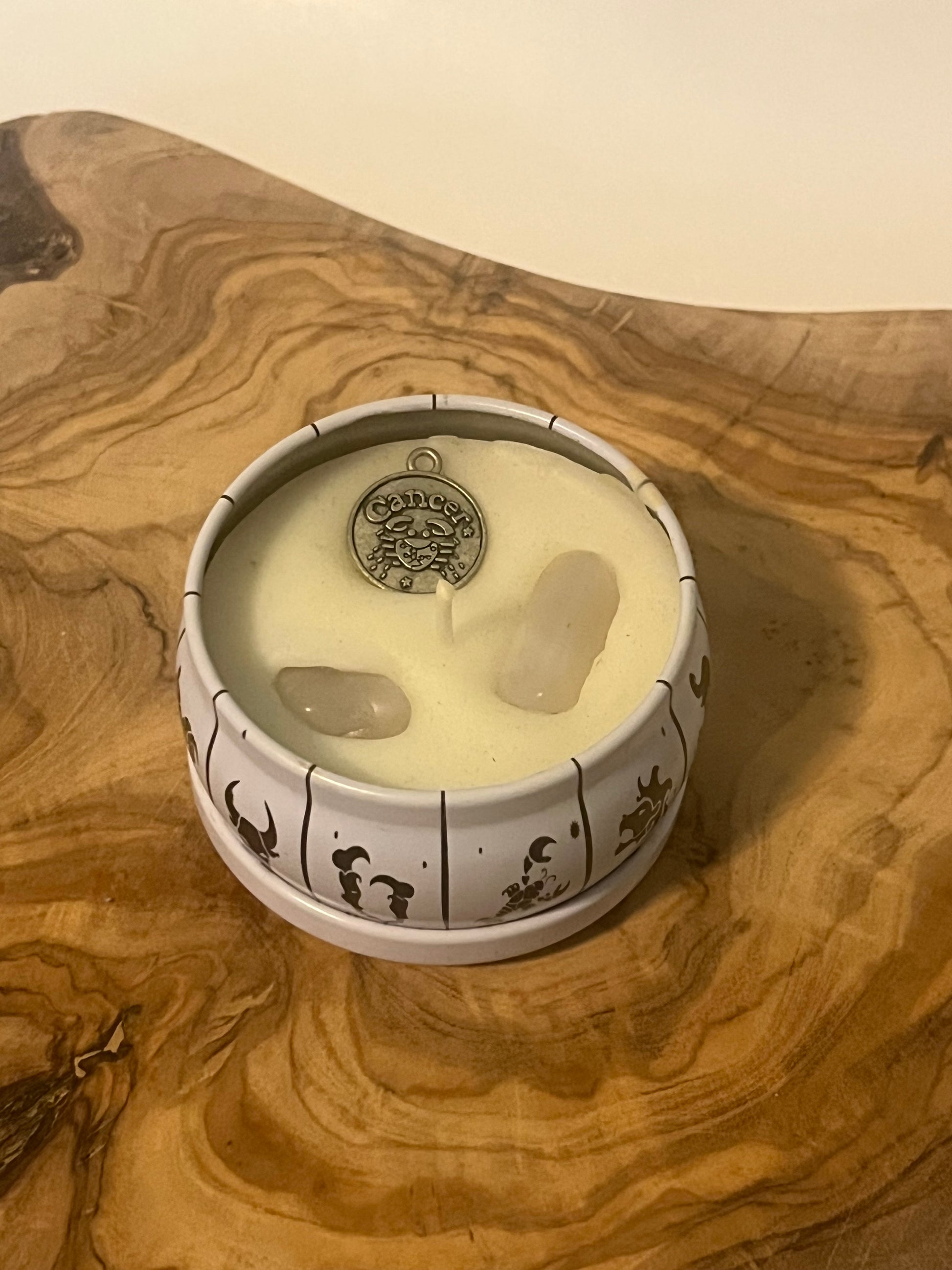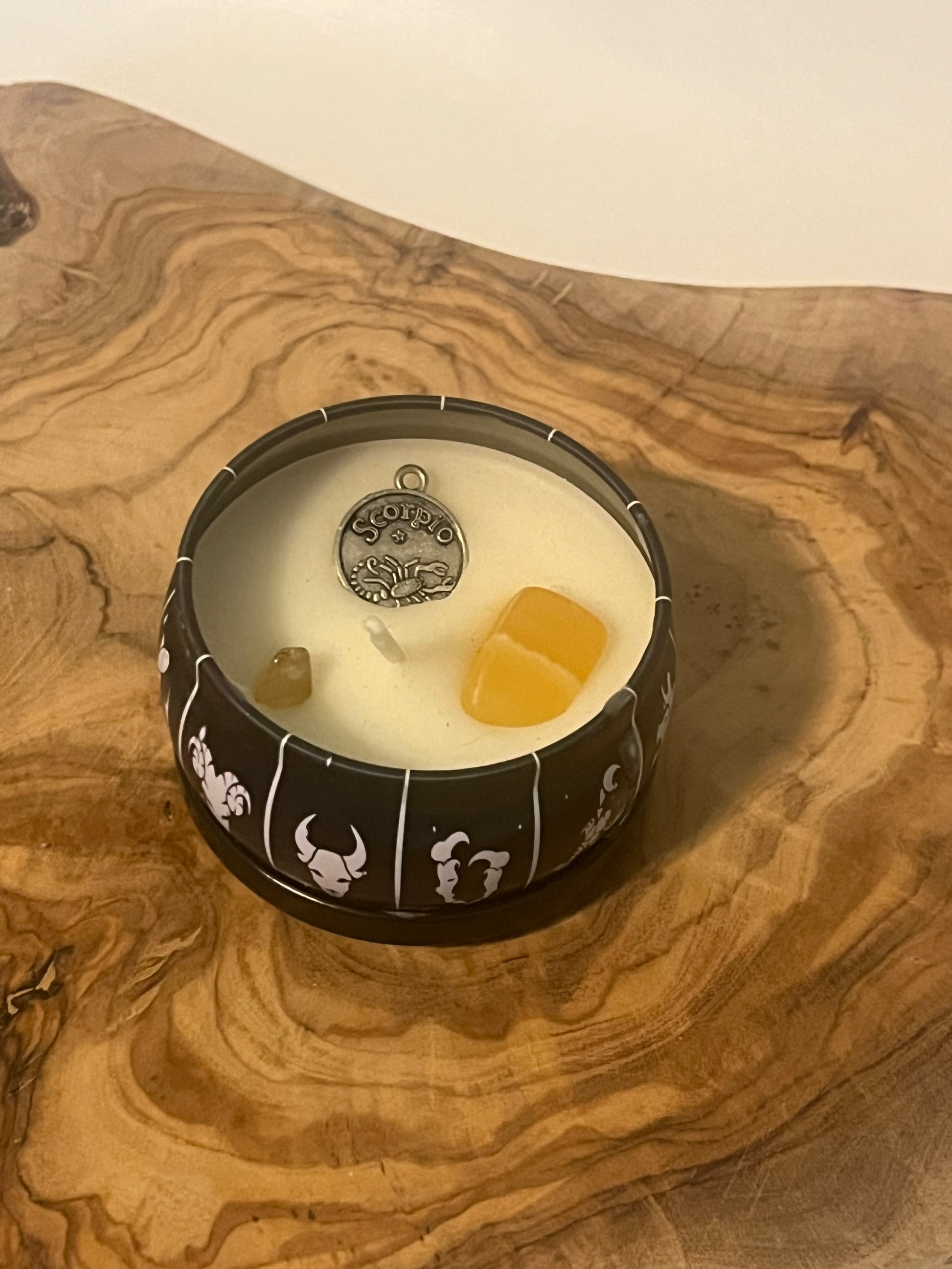 Each candle is embellished with a charm and a crystal. The charm serves as a personal totem or keepsake you can wear or carry with you, a constant reminder of your connection to the stars and the intentions you set while burning the candle. Each candle contains a hand-selected, authentic crystal. The genuine crystal you’ll receive depends on your zodiac sign. The beauty of natural gemstones lies in their imperfections and individuality. Your crystal will possess its own unique characteristics—variations in color, banding, and shape are all natural occurrences. This means the crystal you unearth is truly one-of-a-kind, a special piece of the earth’s energy just for you.
